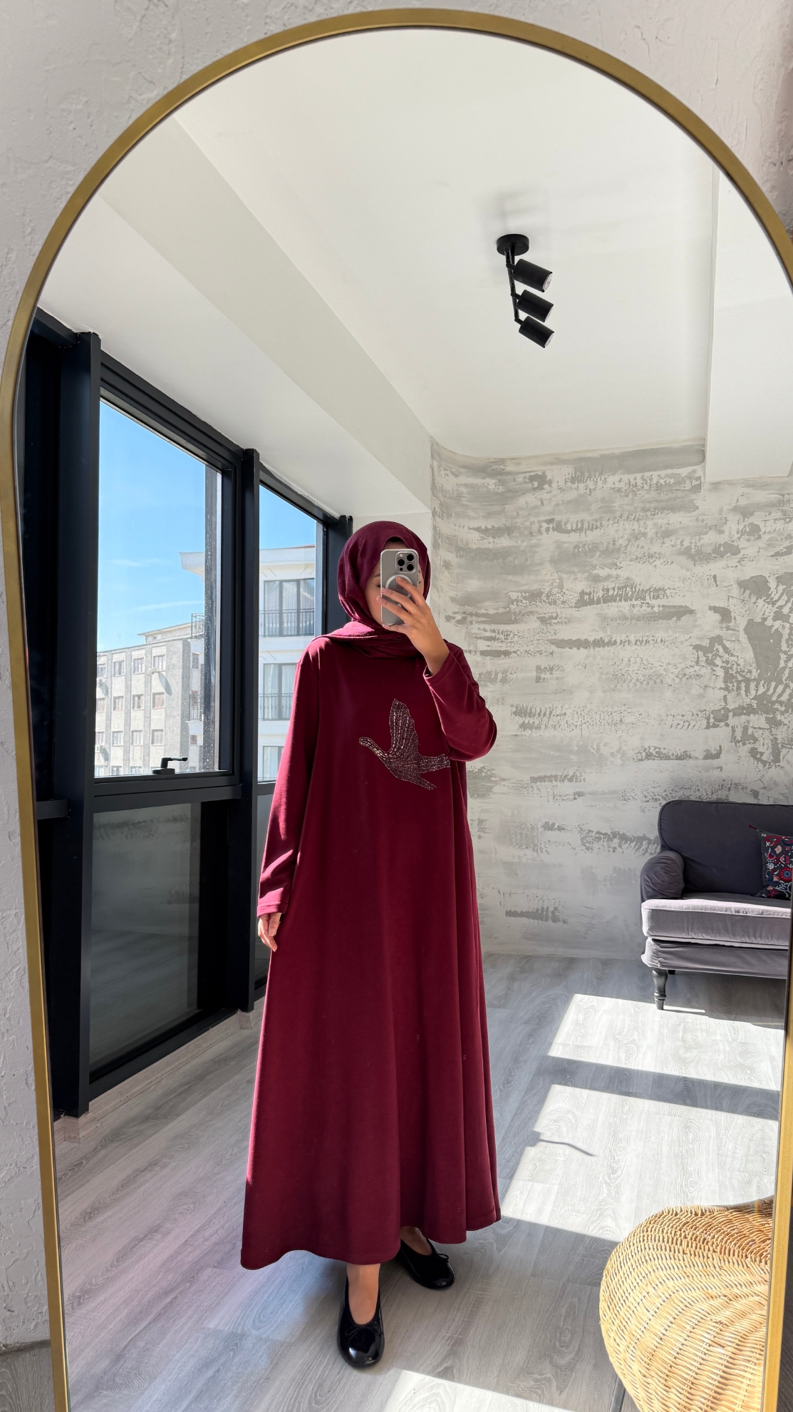 Taşlı Kuş Desenli Penye Tesettür Elbise