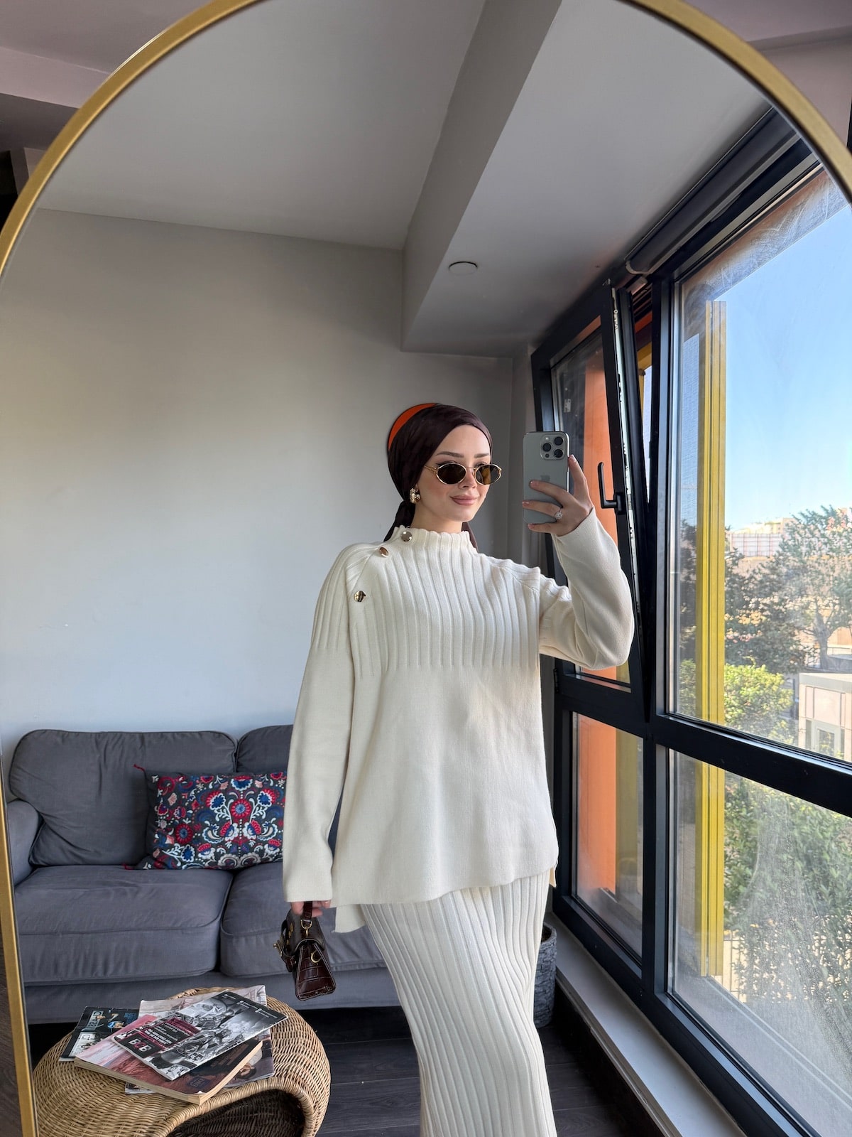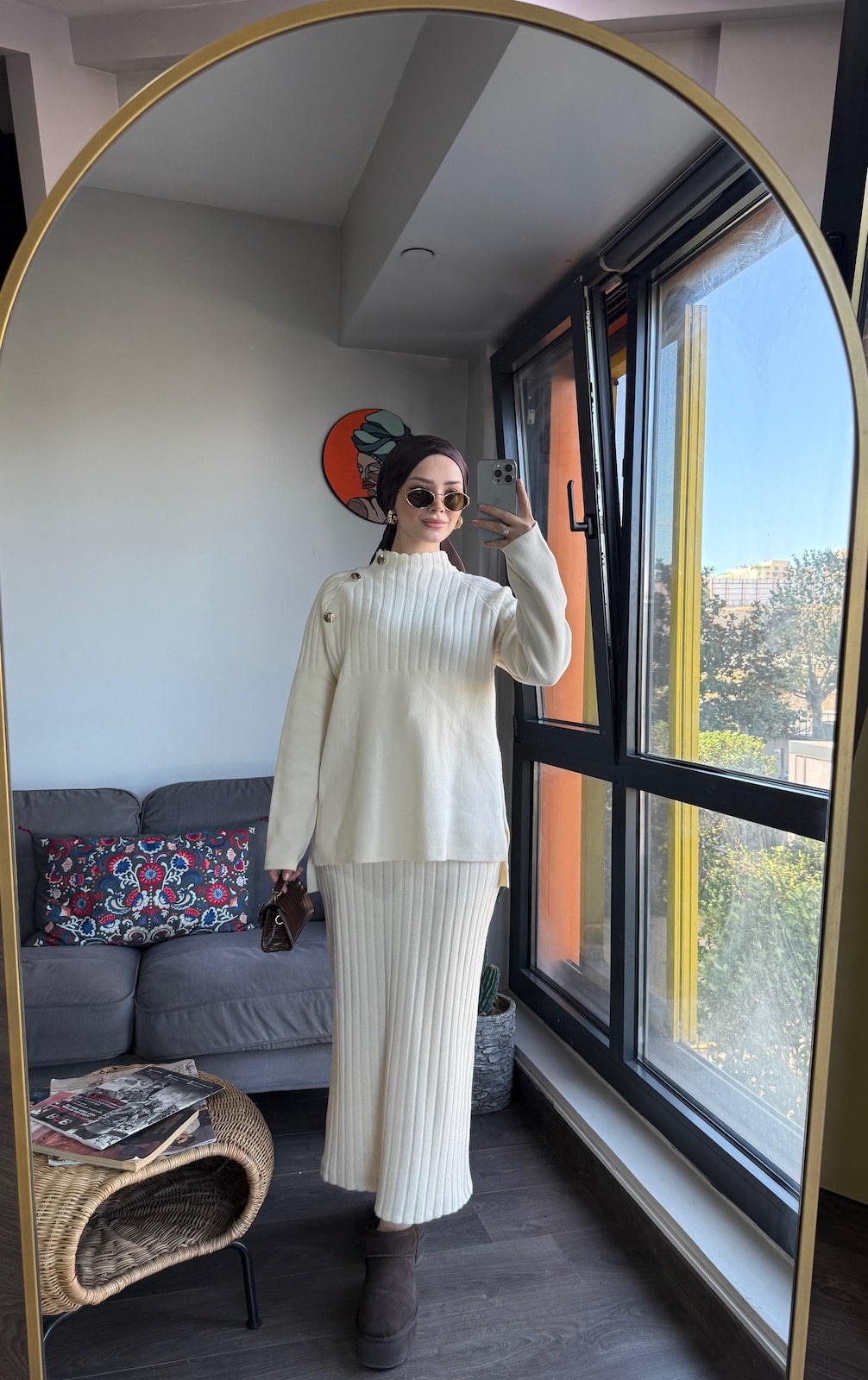 Triko üst boğaz ve düğme detaylı komple fitilli. Şık görünüm ve rahat dokuma. Etek beli lastik detaylı. Tüğlenme yapmaz, yıkama talimatlarına uyulduğu sürece yıllarca dolabınızda yerini koruyacaktır. Şıklık ve Rahatlık bir arada.